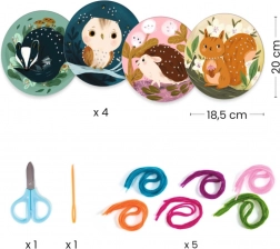 4 Kartonkreise mit Löchern, 20 Wollstränge (50 cm), 5 Farben, 1 Nadel, 1 Paar Scheren, 1 Heft