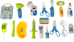 Wagen/EGK-Panel, Brille, Stethoskop mit Sound, Thermometer mit Einstellung und Beleuchtung, Otoskop mit Licht, Blutdruckmessgerät mit Einstellung und Beleuchtung, Hammer, Spritze, Zahnspiegel mit Licht, 2× chirurgische Schere, Skalpell, Schale, Nachbildung Desinfektionscreme, Nachbildung Augentropfen, Nachbildung Medikamentendose, Namensschild des Arztes, Patientenkarte