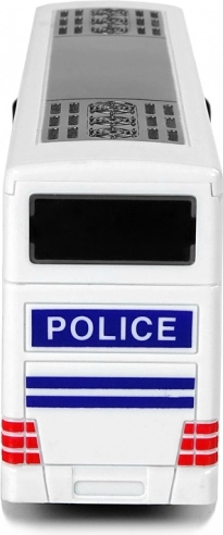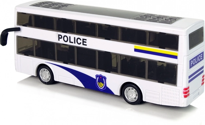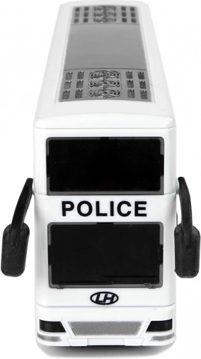 Bereiten Sie kleinen Action-Fans Freude mit einem stylischen Doppeldecker-Polizeibus. Dank des spannenden Pull-Back-Antriebs fährt der Bus nach dem Aufziehen von selbst los, während Licht- und Soundeffekte eine realistische Atmosphäre schaffen. Das weiße Design mit blauen Details, POLICE-Schriftzug und Emblemen wirkt wie ein echtes Einsatzfahrzeug.