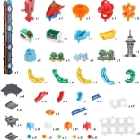 Im Lieferumfang: 143 Teile, 10 Murmeln, elektrischer Zug mit Wagen, elektrischer Aufzug, farbige Aufkleber und eine ausführliche, farbige Anleitung in tschechischer Sprache. Die Bahn lässt sich mit anderen Sets verbinden – der Spaß endet nie.