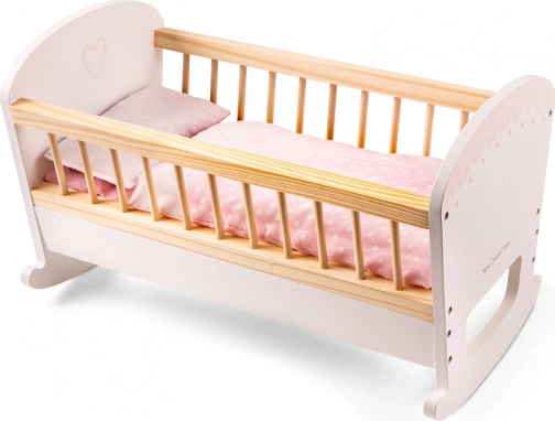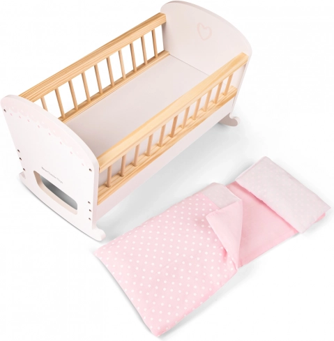 Bezaubernde Holz-Wiege für Puppen oder Kuscheltiere. Die Wiege ist mit einer weichen Matratze, einer Decke und einem Kissen ausgestattet, sodass Puppen jederzeit warm und bequem ausruhen können.