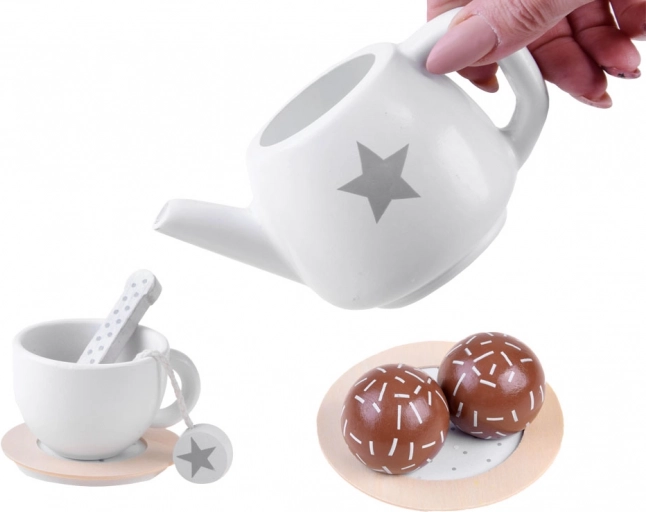 Kännchen, Tassen, Untertassen, Zuckerdose, Milchgießer und Desserts – alles abgestimmt im beige-weißen Design mit Sternchen für perfektes Teerollenspiel.