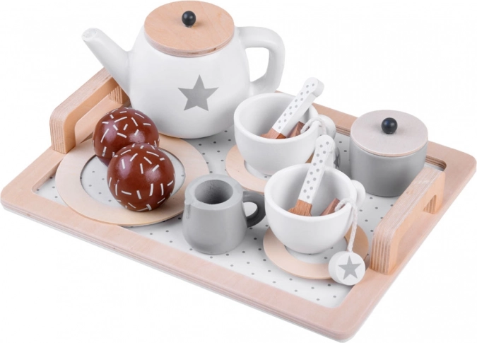 Stilvolles Holz-Teeset in sanften Beige- und Weißtönen für ein sicheres Rollenspiel rund um die Teestunde. Enthält Tablett, Kännchen, Tassen, Untertassen, Zuckerdose, Milchgießer und hölzerne Leckereien – alles mit niedlichen Sternchen- und Punktmotiven. Robuste Holzausführung, glatte Kanten und ungiftige Farben fördern Fantasie und soziale Kompetenzen der Kinder.