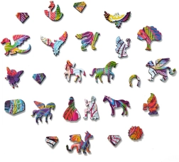 Holzpuzzle Regenbogen Einhorn ist eine hervorragende Wahl für Puzzle-Liebhaber, die ein unterhaltsames und anspruchsvolles Erlebnis suchen. Dieses komplexe Puzzle bietet bunte und einzigartige Teile, die zusammen ein Bild eines magischen Einhorns schaffen.