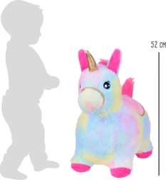Dieses Hüpf-Einhorn vereint einen robusten aufblasbaren Gummikörper mit einem weichen, angenehmen Plüschbezug in Regenbogenfarben. Sorgfältig gearbeitete Details wie gestickte Augen, goldenes Zaumzeug, ein weicher Stoffsattel mit goldener Paspel sowie eine rosa Mähne mit Schweif werden Kinder begeistern. Zwischen den Ohren ist eine Pfeife versteckt, die jedes Hüpfen zusätzlich aufpeppt.