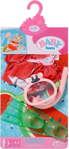 Bereite deine BABY born Puppe auf sommerliche Wasserabenteuer mit einem stylischen Schnorchel-Set vor. Das Set enthält einen zweiteiligen Badeanzug mit niedlichen Rüschen, eine Tauchmaske mit Schnorchel und grüne Flossen – alles in verspielten Farben aufeinander abgestimmt für realistische Wasserspiele und kreatives Rollenspiel.