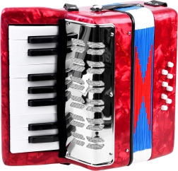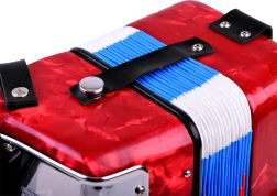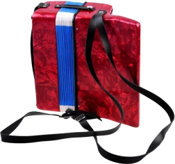 Dieses große Kinder-Akkordeon überzeugt durch realistische Verarbeitung und einfache Bedienung. Der Klang entsteht wie bei einem echten Akkordeon – durch Ziehen und Drücken des Balgs. Dank der bequemen Handschlaufe und der Lederschulterriemen liegt es gut in der Hand und lässt sich angenehm spielen. Die Balgklammer schützt das Instrument beim Transport und bei der Aufbewahrung.