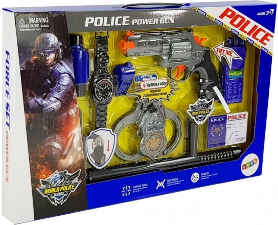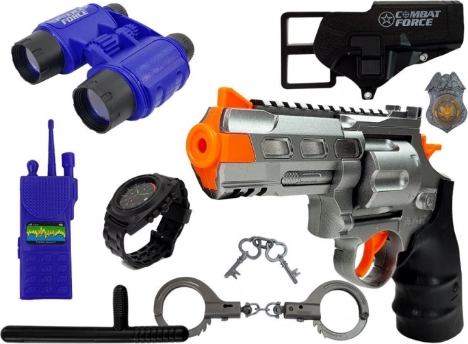 Polizei-Set für Kinder – Pistole mit Licht und Sound, Handschellen, Fernglas, Walkie-Talkie, Abzeichen und Zubehör