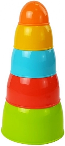 Diese farbige Schalen-Pyramide ermöglicht es Kindern, Türme zu bauen, Schalen ineinanderzustecken und nach Größe oder Farbe zu sortieren. Das Spiel fördert auf natürliche Weise die Fingerfertigkeit, den Griff sowie die Hand-Auge-Koordination und vermittelt zugleich das Verständnis für Größenverhältnisse.