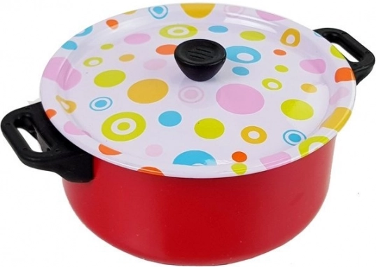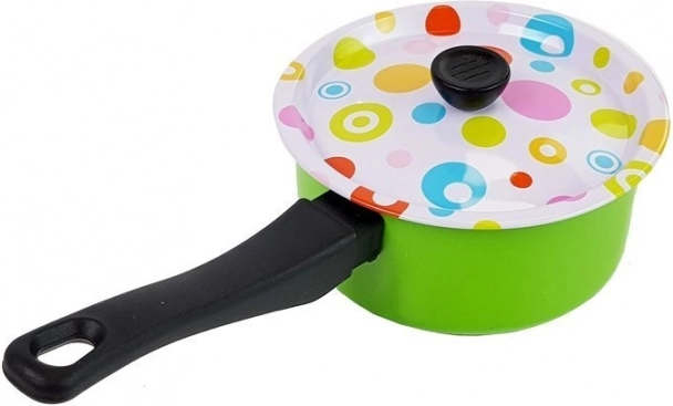 Töpfe, Stieltopf und Pfanne mit Deckeln sehen aus wie echtes Kochgeschirr – mit bequemen Griffen und glänzender Oberfläche für ein authentisches Kocherlebnis.