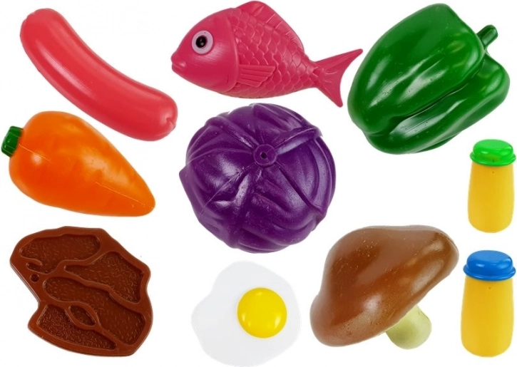 Zum Set gehören auch verschiedene Lebensmittel, die zu fantasievollem Spiel anregen und beim Erlernen von Namen und Formen der Speisen helfen.