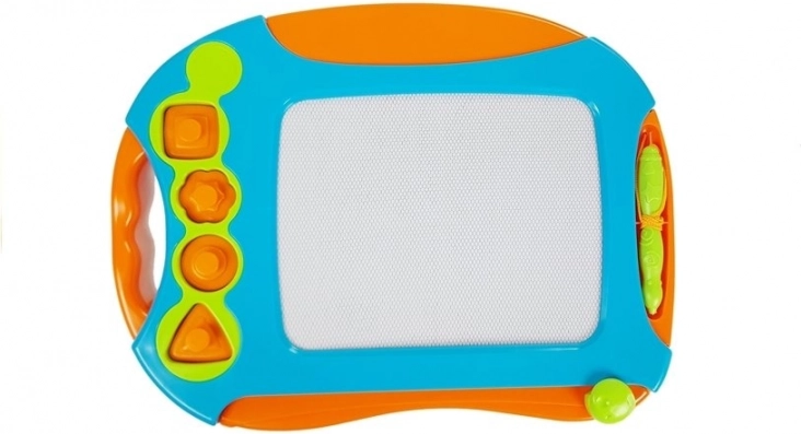 Zum Set gehören eine große Tafel mit praktischem Griff, ein Magnetstift und vier Stempel in geometrischen Formen. Die robuste Kunststoffausführung, harmonische Farben und durchdachte Details machen sie zum idealen Spielzeug für zu Hause, den Kindergarten und unterwegs.