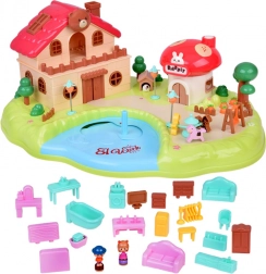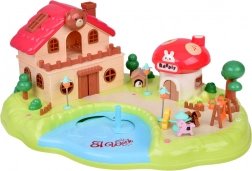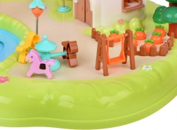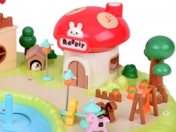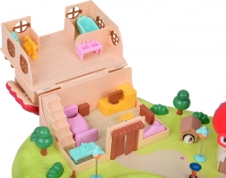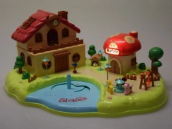 mehrstöckiges Häuschen, Pilzladen, Garten mit Teich, Figuren, Möbel und Zubehör, Spielplatzelemente (Karussell, Schaukel)