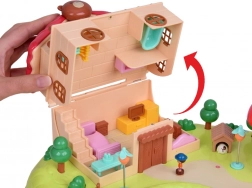 Schlafzimmer mit aufklappbarem Kleiderschrank, Badezimmer mit Badewanne und Waschmaschine, Küche mit Kühlschrank und ein Zimmer mit Schminktisch. Draußen warten ein Spielplatz mit Karussell und Schaukel sowie ein Laden in Pilzform.