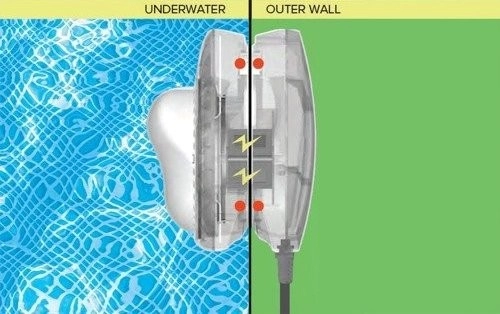 Der Innenteil wird kabellos durch die Poolwand hindurch versorgt. Kein direkter Kontakt von Elektrizität mit Wasser – maximale Sicherheit beim Baden.