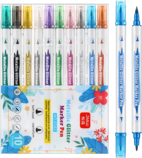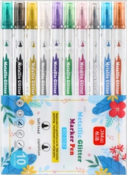 Diese metallischen Glitzer-Marker verleihen Ihren Projekten intensiven Glanz und Tiefe. Das doppelseitige Design ermöglicht den Wechsel zwischen präzisen Details und satten Flächenstrichen – ideal für Hand Lettering, das Verzieren von Karten, Scrapbooking und Schulprojekte. Der metallische Effekt mit feinem Glitzer kommt auf hellem wie dunklem Untergrund zur Geltung.