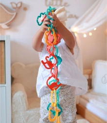 Dank der praktischen Form verbinden Kinder die Glieder schnell zu Ketten, befestigen damit Spielzeuge und erstellen eigene bunte Arrangements – kreativer Spaß zu Hause und unterwegs.