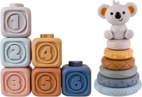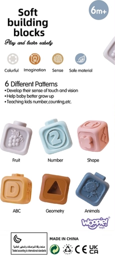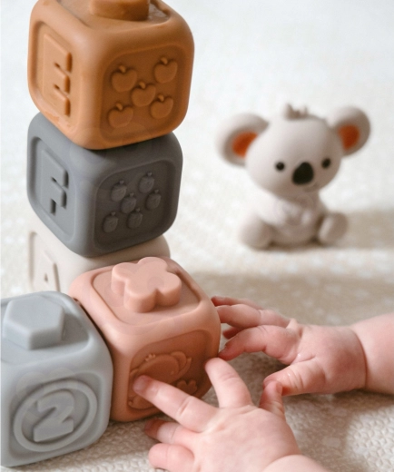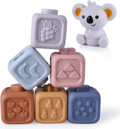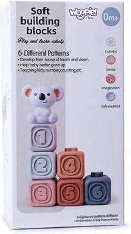 Weiche sensorische Silikonbausteine von WOOPIE in zarten Pastellfarben fördern die frühe Entwicklung Ihres Kindes von Geburt an. Sechs Würfel mit erhabenen Zahlen schulen Tastsinn, Sehen und Logik; das sichere Material dient auch als Beißring beim Zahnen. Die Würfel lassen sich stapeln, drücken (sie quietschen), dank Reliefs verbinden und machen auch bei Wasserspielen Spaß. Ein niedlicher Koala verleiht dem Set verspielten Charme.