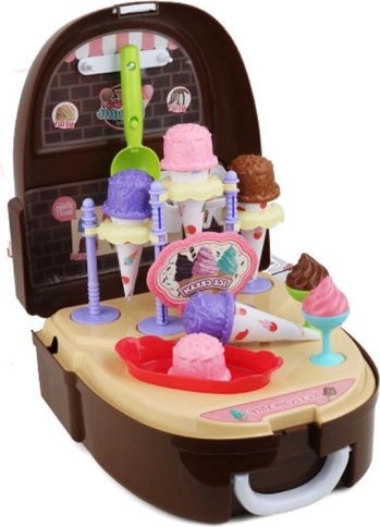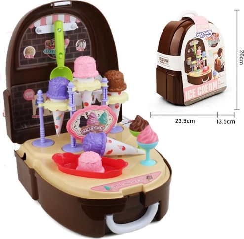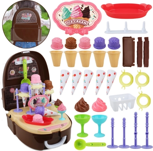 Der kleine Konditor ist immer startklar! Dieses niedliche Set in Form eines Rucksacks verwandelt sich nach dem Öffnen in eine komplette Eisdiele und einen Mini-Laden. Kinder können Kugel-Eis servieren, Waffeln befüllen und süße Leckereien an Freunde und Eltern verkaufen. Dank der leichten Konstruktion nehmen sie es mühelos mit auf den Spielplatz, zu den Großeltern oder in den Urlaub.