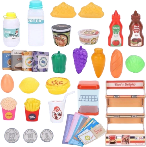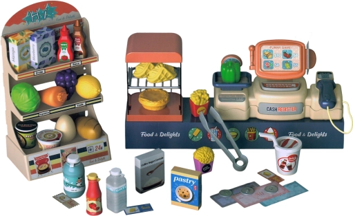 - Supermarkt mit Regal, Kasse, Barcode-Scanner, Waage, Papiergeld, Münzen, verschiedene Lebensmittel (Obst, Gemüse, Getränke u. a.), Greifzange