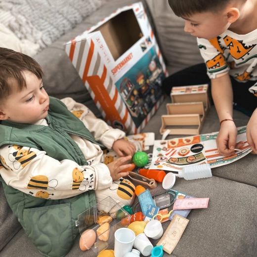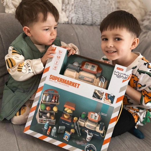 Das Kaufladenspiel fördert selbstständiges Denken, Kommunikation und kreatives Spiel. Dank 42 Elementen – von Obst und Gemüse bis hin zu Getränken und Konserven – können Kinder eigene Szenarien erschaffen und Alltagssituationen üben.