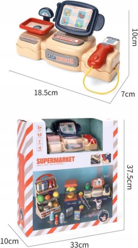 - Realistische Elemente: Scanner mit Sound, Kasse mit Schublade, Waage und Regal mit Lebensmitteln.