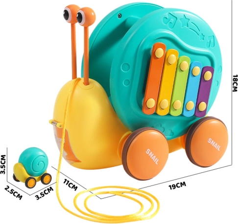 Unterhaltsames und lehrreiches Spielzeug für die Kleinsten: Die bunte Schnecke zum Ziehen verbindet Ziehen und Fahren, ein Xylophon mit herausnehmbaren „Augen“-Schlägeln, Getriebe-/sensorische Elemente und ein abschießbares Auto. Fördert Motorik, logisches Denken und die Liebe zur Musik durch vielfältige Spielmöglichkeiten.