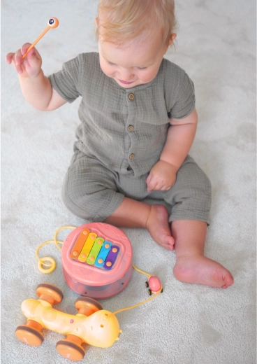 - stabiles Zugband, integriertes Xylophon, herausnehmbare Augen–Schlägel, kleines Auto