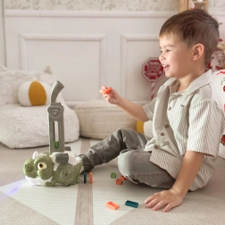 Das unterhaltsame Woopie-Spielzeug vereint eine Dinosaurier-Lokomotive und das automatische Aufstellen von Dominosteinen in einem interaktiven Set. Dank Licht- und Soundeffekten begeistert es Kinder, hält ihre Aufmerksamkeit und fördert Feinmotorik sowie Vorstellungskraft. Einfach den Magazinaufsatz mit Dominosteinen füllen, die Lok starten und zusehen, wie sie eine bunte Strecke legt.