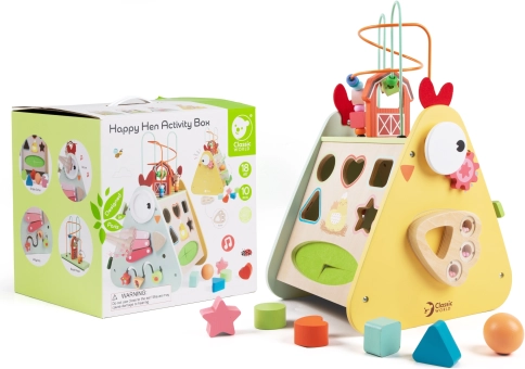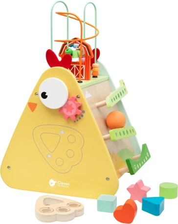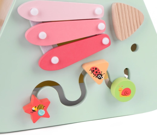 Xylophon, Labyrinth, Perlen, Zahnräder, Sortierer und weitere clevere Elemente fesseln Kinder stundenlang und fördern spielerisches Lernen.