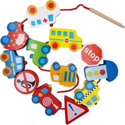 Im Set enthalten sind 12 Holzklötzchen mit Fahrzeugmotiven und 1 Schnur mit Holzstäbchen zum einfachen Durchfädeln. Durch das Auffädeln der Elemente lassen sich eigene „Kolonnen“ oder Stadtgeschichten erstellen – vom Feuerwehrauto über das Polizeifahrzeug bis hin zu Bus und Verkehrszeichen.
