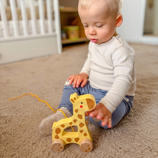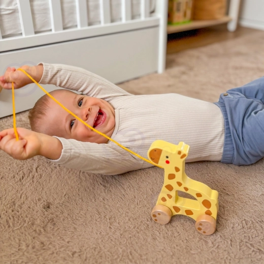 Beim Ziehen an der Schnur rollt die Giraffe sanft und motiviert Kinder zu eigenständiger Bewegung, stärkt das Gleichgewicht und die Hand-Auge-Koordination.