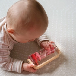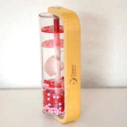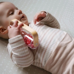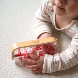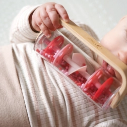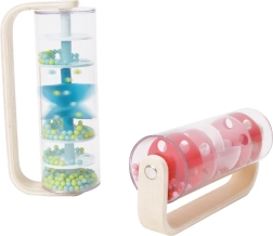 Dieser rote Regenstab kombiniert natürliches Holz mit einem transparenten Korpus voller Kügelchen, die beim Bewegen sanft rieseln und ein entspannendes, rhythmisches Geräusch erzeugen. Kinder können das Spielzeug schütteln, um 360° drehen und beobachten, wie die Perlen von oben nach unten wandern – ein großartiger Reiz für Sehen, Hören und Feinmotorik.