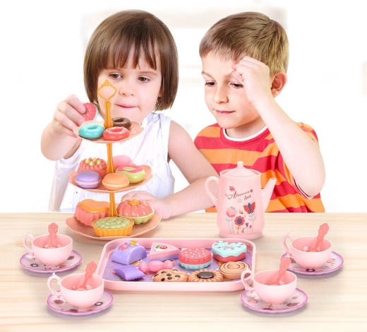 Holz-Teeset rosa mit Blumen und Erdbeeren