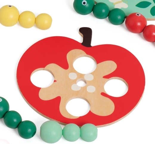 Das Greifen der Perlen und das präzise Zielen in die Öffnungen unterstützen die Feinmotorik, Geduld und Aufmerksamkeit der Kinder.