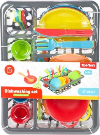 Verspieltes Küchenset für kleine Köchinnen und Köche mit 27 Teilen – Topf, Pfanne, Teller, Tassen, Besteck und weiteres Zubehör. Fördert Kreativität, Feinmotorik sowie soziale Kompetenzen beim Spielen rund ums Kochen und Servieren. Die praktische Blisterverpackung hält alles ordentlich beisammen. Geeignet für Kinder ab 2 Jahren.