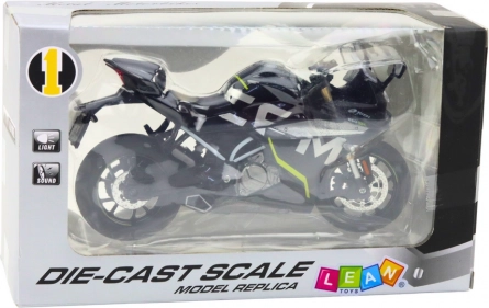 Das Sportmotorradmodell in elegantem Schwarz imitiert eine echte Rennmaschine. Dank Metallteilen und präzise ausgearbeiteten Details ist es ideal als Deko auf dem Regal sowie als robustes Spielzeug für den täglichen Gebrauch. Integrierte Licht- und Soundeffekte verstärken das realistische Erlebnis.