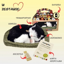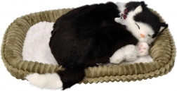 Dieses realistische Plüschkätzchen in Schwarz-Weiß schläft friedlich in seinem Körbchen und „atmet“ sanft, wodurch eine gemütliche Atmosphäre und das Gefühl der Anwesenheit eines echten Haustiers entstehen. Dank der detailreichen Verarbeitung, dem Halsband mit Anhänger und dem weichen Fell ist es ein tolles Geschenk für Kinder ab 3 Jahren und Katzenliebhaber.