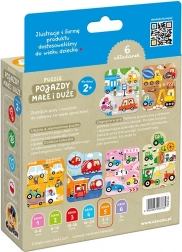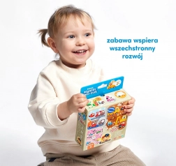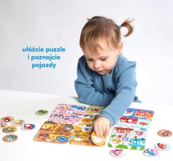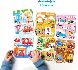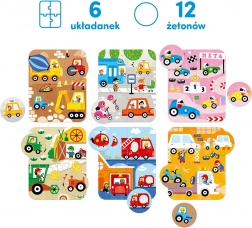 In der Box finden Sie sechs farblich differenzierte, vierteilige Puzzles mit beliebten Fahrzeugen – vom Feuerwehrwagen und Rennwagen bis hin zu Traktor und Abschleppwagen. Nach dem Zusammensetzen werden die Puzzles zu Spielplänen, denen die Kinder 12 thematische Jetons zuordnen. Das fördert das Erlernen neuer Wörter, die Entwicklung der visuellen Wahrnehmung und des logischen Denkens.