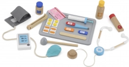 - Professionelle medizinische Instrumente wie Blutdruckmessgerät, Stethoskop, Thermometer, Reflexhammer, Röntgengerät, Injektionsspritzen, Tabletten und Medikamentenfläschchen,