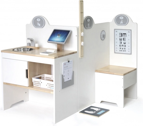 Multifunktionales Gesundheitszentrum der bekannten und geschätzten Marke Viga ist ein großartiges Spielzeug, das Ihrem Kind ermöglicht, den Beruf des Arztes oder der Krankenschwester kennenzulernen. Es umfasst Behandlungsraum, Wartezimmer, Waschbecken und Rezeption zusammen mit professionellen medizinischen Instrumenten wie Stethoskop, Blutdruckmessgerät, Reflexhammer, Thermometer, Röntgengerät, Injektionsspritzen, Tabletten und Pillendosen.
