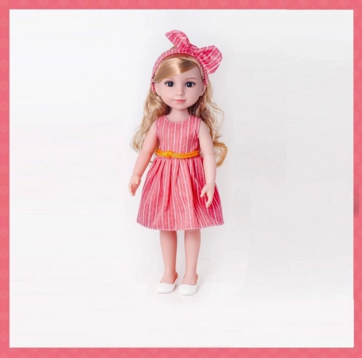 Puppe PLEJO in roten Kleidern ist ein wunderschönes Stück für jedes Spielzeuggeschäft. Tolle Haare machen sie noch attraktiver.