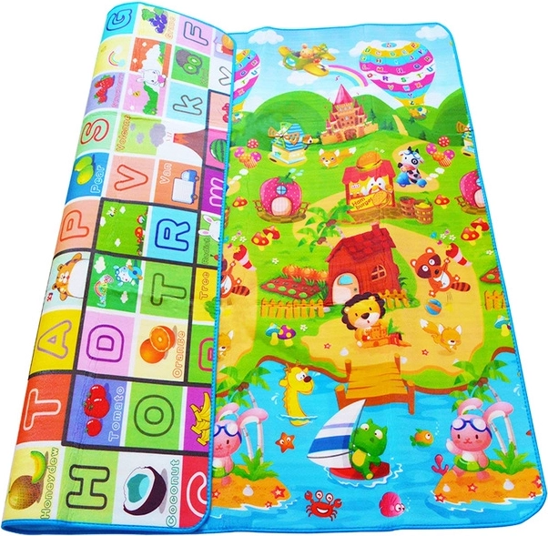 Wir präsentieren Ihnen die zweilagige Spielmatte, die eine ideale Ergänzung für jedes Kinderzimmer ist. Ihr zweiseitiges Design bietet unterhaltsame pädagogische Elemente - auf der einen Seite ist das Alphabet abgebildet und auf der anderen Seite eine Spielfläche mit Dorfmotiv.