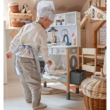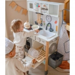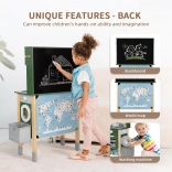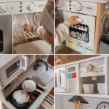 Diese WOOPIE GREEN Holzküche wurde für kleine Köchinnen, Köche und Entdecker entwickelt. Die Vorderseite bietet eine umfangreich ausgestattete Kochzone mit Kaffeemaschine, Mikrowelle, Spüle, Ofen, Geschirrspüler und einer Induktionskochplatte mit Licht und Geräuschen. An der Seite befindet sich eine praktische Waschmaschine mit Wäschekorb, die spielerisch Alltagsroutinen vermittelt. Die Rückseite verbirgt eine Kreidetafel und eine farbige Weltkarte zum Zeichnen, Kennenlernen der Kontinente und zur Entfaltung der Fantasie.