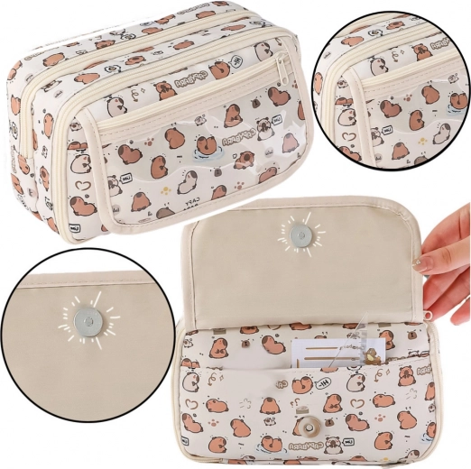Großes und funktionelles Mäppchen mit Capybara-Motiv ist ideal für Schüler, die Praktikabilität und niedliches Design schätzen. In Cremeton mit sympathischem Capybara-Druck sticht das Mäppchen unter anderen Schulmaterialien hervor. Es ist geeignet für Schule, Universität, Kunstunterricht oder das Homeoffice.