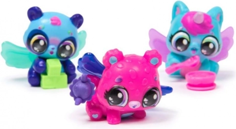 - Glitzernder Karton mit integriertem Nest, 5 neonfarbene Eier, 5 Figuren, Flügelchen, 6 Pflege-Accessoires
