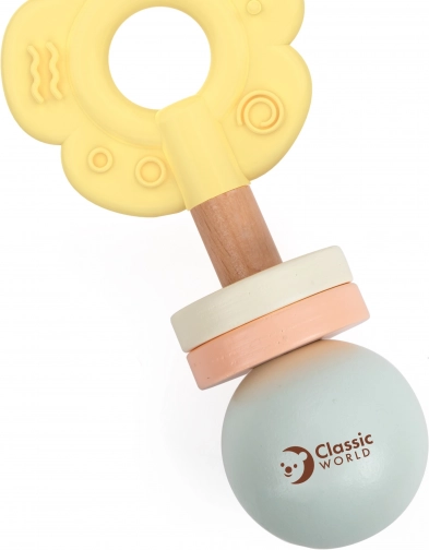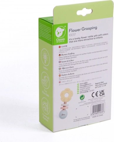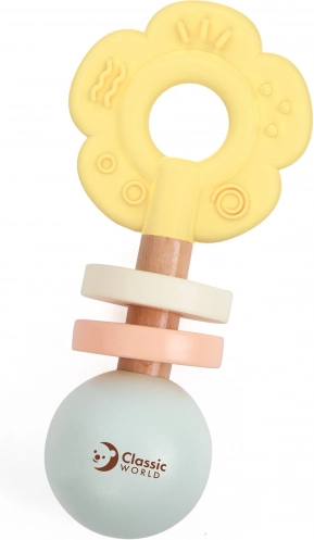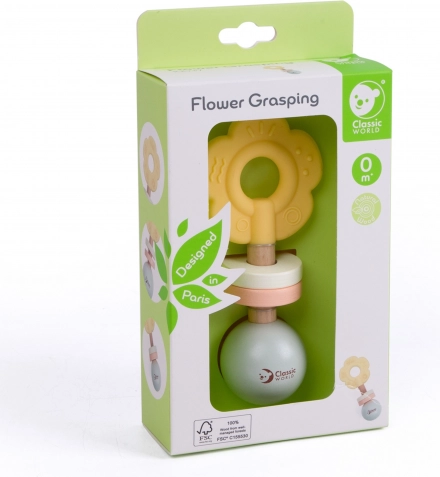 Niedliche Rassel in Blütenform, entworfen für die kleinsten Kinder, mit sanften Pastellfarben, die die Aufmerksamkeit des Kindes anziehen. Hergestellt aus sicheren Materialien, Holz und Silikon, geeignet ab der Geburt.