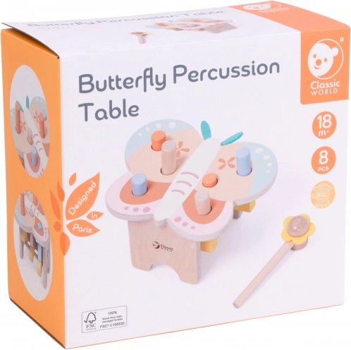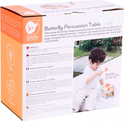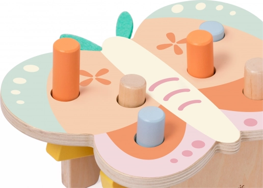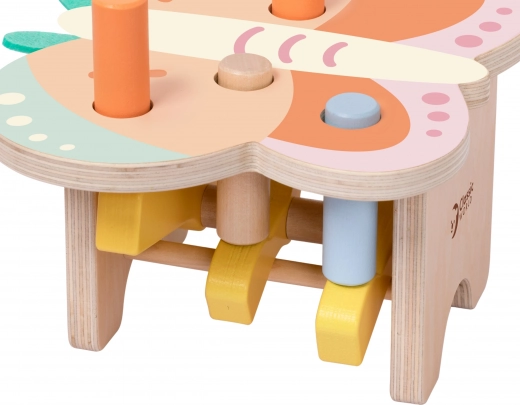 Der hölzerne Tisch in Schmetterlingsform ist ideal für das kindliche Spiel, das zu Aktionen anregt und Klänge entdeckt. Diese bunte und ansprechende Spielweise unterstützt die Entwicklung motorischer Fähigkeiten und die Hand-Auge-Koordination. Das Set enthält einen Hammer in Blumenform, der Charme hinzufügt und Kinder zum aktiven Spielen anregt.