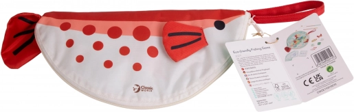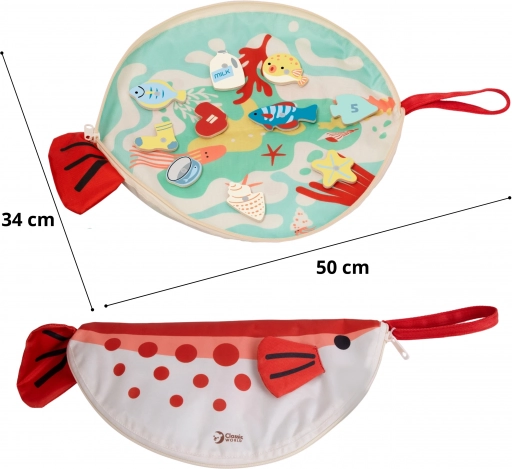 Die Spielmatte in Fischform lässt sich nach dem Spielen leicht zu einem Etui mit Reißverschluss zusammenfalten, in dem alle Komponenten Platz finden. Hochwertige Holzverarbeitung und sichere Materialien gewährleisten eine lange Lebensdauer und Widerstandsfähigkeit im täglichen Gebrauch.