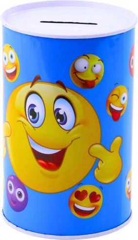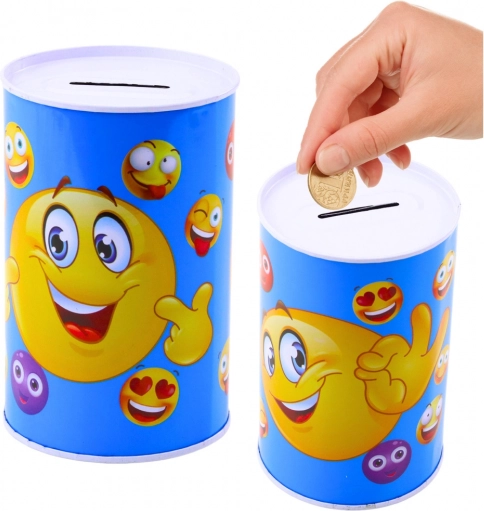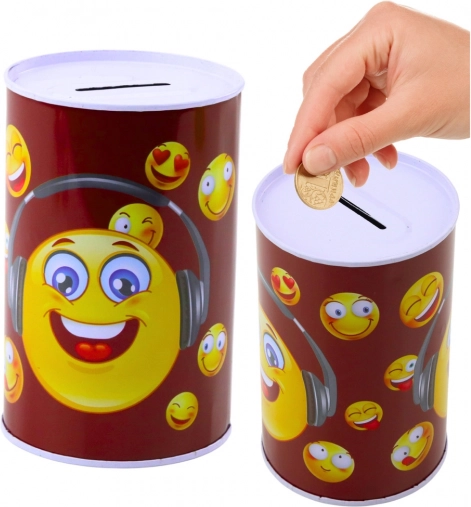Bunte Metall-Spardose mit Emojis für Kinder, blaue und braune Variante. Lehrt Sparen und entwickelt finanzielle Gewohnheiten.